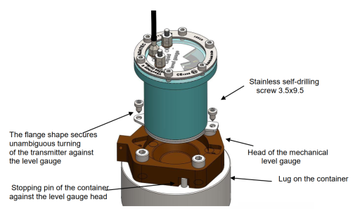 The LevelSense Node sensor is mounted with two screws to the horizontal connection flange of the Junior type.