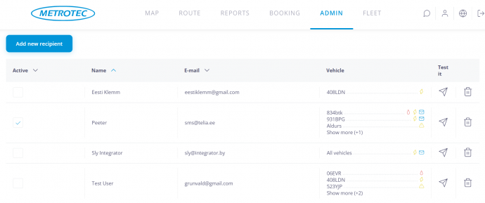 Dessutom är det viktigt att få påminnelser om s k rutinmässiga skyldigheter såsom besiktning, försäkring eller tekniskt underhåll. Larmsystemet delar in dessa händelser i olika kategorier och möjliggör att meddela de behöriga personerna om dessa. Du kan ange ett obegränsat antal mottagare och koppla dem till olika lastbilar.