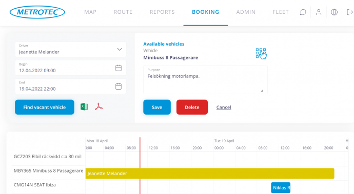 - Tidsbokning för tekniskt underhåll, besiktningar, reparationer och däckbyten