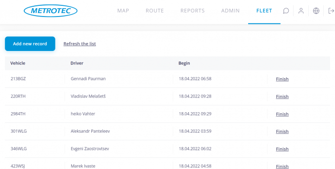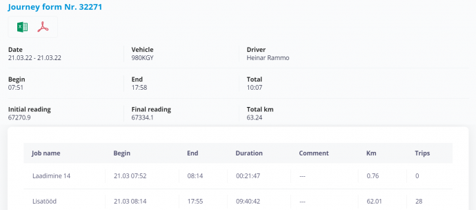 En redovisning av arbetsdagen kombinerad med en lista över utförda arbeten. Översiktligt och kortfattat visas vad som är gjort var, hur mycket tid som gick åt till det och vilka sträckor som har körts. Lätt att använda för föraren – arbetet kan väljas i en lista på en smart telefon och sedan knappas in som utfört. Resultatet är en prydlig logg, där GPS:en har kompletterat varje post med antalet körda kilometer eller arbetade motortimmar. Beroende på installation eller fordonstyp kan man lägga till data om bränsleförbrukning, antal flaktippningar, adress, körtid utan/med last osv. Möjligheterna är många.