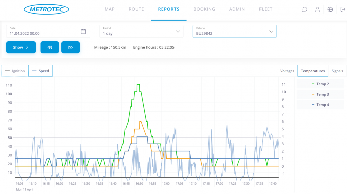 Diagram beskriver temperaturdynamiken i tidigare datahistorik. Datahistoriken visar tydligt när ett visst temperaturvärde blev uppmätt. När detta jämförs med körsituationen, fordonets position och data från fordonets system kan man förstå vad som berodde på vilka skäl och förhållandet mellan olika omständigheter.